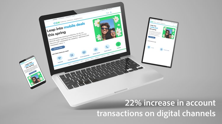 Integration across Adobe tools accelerates content time to market. Cox can go live in a matter of minutes with new mobile devices launches, TV plans, pricing, time-sensitive specials for broadband and other offers. Promotions can launch any time of the day, without disrupting business on websites. “We can build offers for cross-selling and bundles, test customer response and shift gears quickly to keep increasing sales,” adds Faure.