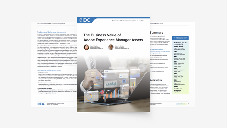 Laut IDC verzeichnen Nutzende von Adobe Experience Manager Assets jährlich einen Zuwachs von 9,04 Millionen US$, weil sie mehr Abschlüsse erzielen, Kosten einsparen, die Asset-Erstellung beschleunigen und die Team-Produktivität steigern.