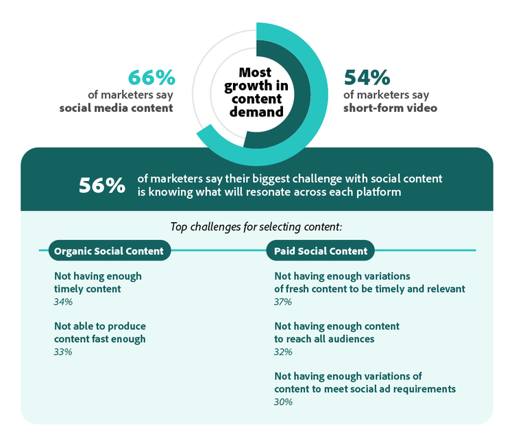 As the rise of the creator economy and the impact of virality and engagement online has taken centre stage, it’s never been more important for brands to understand how content resonates on social platforms and marketers are already thinking about this. Sixty-six per cent of marketers say that the demand for social content is growing the fastest, with short-form video following closely at 54%. Whether driving engagement with a particular audience or fostering brand loyalty with branded social and influencer content, marketers are thinking about what content will stand out most on social. However, many teams continue to struggle to produce enough content that performs well, as over half of marketers (56%) cited that their biggest challenge with social content is knowing what will resonate across each platform.