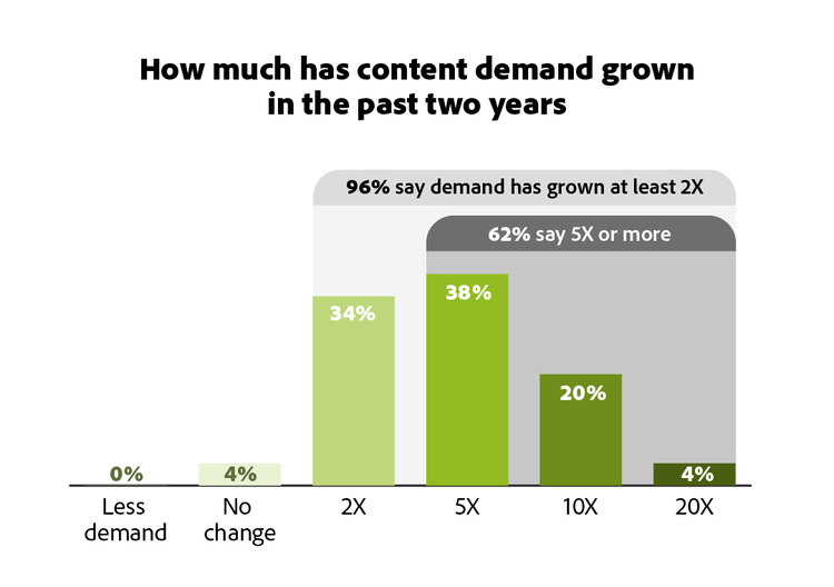 In new Adobe research across more than 1600 marketers, nearly all respondents (96%) have seen content demand increase at least 2X over the last two years, with 62% saying it has increased 5x or more. The research also shows that marketers are shifting their content production process and strategies to keep pace, as most marketers (71%) also anticipate content demand to grow more than 5x between now and 2027.