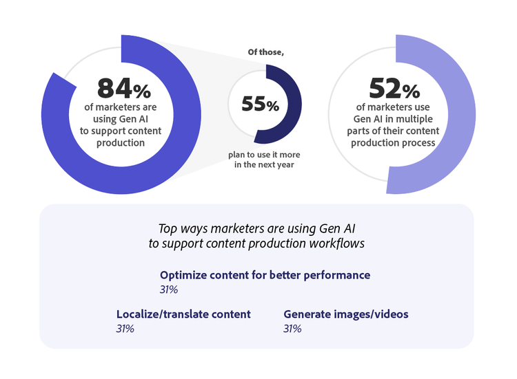 Amidst increasing content demands, marketers are evolving their workflows with the help of generative AI. Marketers are using it throughout the content process to help them scale production, improve collaboration and create better quality content that is more data-driven and performant. From optimising content for better performance (31%), translating for global audiences (31%) and generating multimedia assets like images and videos (31%), marketers are adopting generative AI across the content lifecycle to address their unique needs and challenges. Over half of respondents (52%) say they use generative AI in multiple parts of their content production process. Eighty-four per cent of marketers say they plan to use generative AI to support content workflows in the next year and 55% plan to increase their usage.