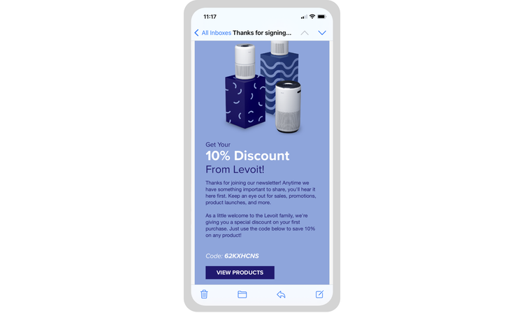 This welcome email from Levoit is sent to the consumer’s inbox less than five minutes after signup. It sets expectations, immediately offers a unique discount code and includes a convenient CTA to encourage a quick conversion.