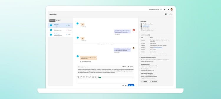 Then, once a customer is scheduled to meet with a sales agent, the conversation summaries feature in Dynamic Chat appears directly in both their customer relationship management system and their agent inbox to provide a summary of prior conversations, key discussion topics, and other historic visitor engagements across chat and other digital channels. Conversation summaries cut down on prep time and provide additional insights to ensure productive conversations. With Dynamic Chat’s native integration with Marketo Engage, these summaries are also available as trigger tokens that can be used for further campaign personalization based on topics discussed or questions asked.