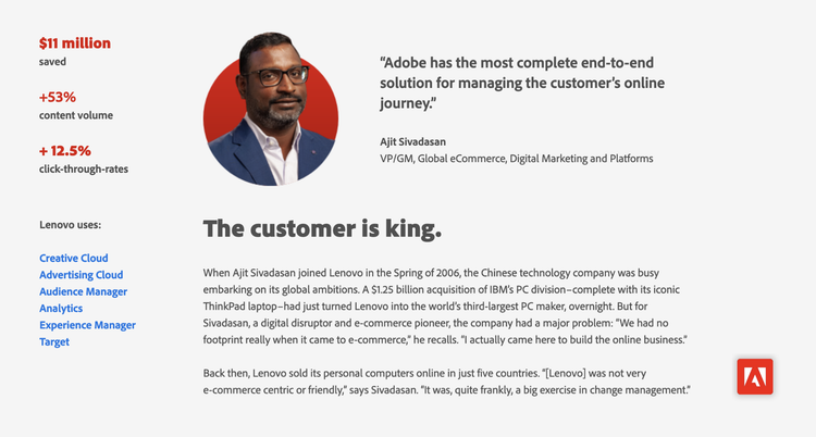 The story of Lenovo’s journey with Adobe is one that spans years of planning, implementation and roll-out. The Lenovo case study does a great job of consolidating all of this into a relatable journey that other enterprise organisations can see themselves taking, despite the project size. This case study also features descriptive headers and compelling visual elements that engage the reader and strengthen the content.