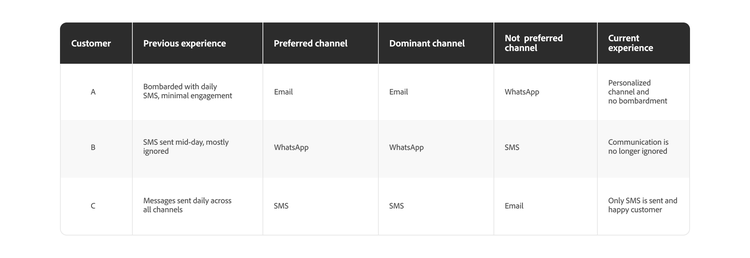 Then, Adobe Data Distiller classifies channel preference to determine preferred, dominant and not preferred channels.