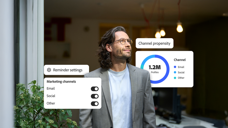Man wearing a suit jacket standing outside. Overlaid with reminder settings for marketing channels and a channel propensity chart.