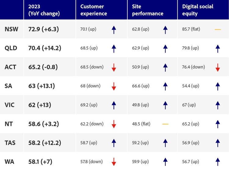 Australia’s overall Benchmark score was pushed higher by a 33% uplift in the Digital Equity dimension, followed by a 19% increase in site performance. However, customer experience remained practically unchanged, holding back a higher score.