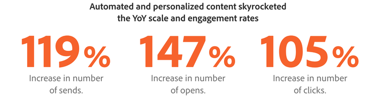 For example, rather than building endless variations of onboarding flows to account for users’ in-tool activity, marketers use tokens to dynamically populate tailored content that reflects the readers’ experience to date. As a result of this automated and personalized approach, the YoY scale and engagement rates skyrocketed with an increase of 119% in the number of sends, 147% in the number of opens, and 105% in the number of clicks.