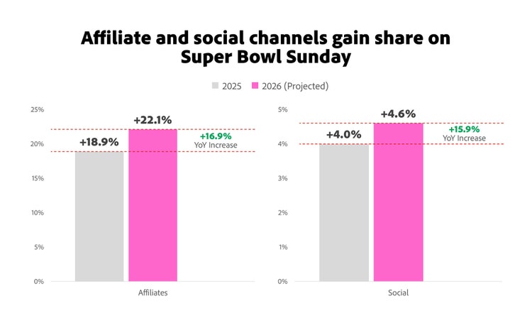 As Super Bowl hype builds, the competition doesn’t stop at the goal line. Digital channels have become key players in how fans shop, whether they’re locking down party essentials or perfecting their game-day look. On Super Bowl Sunday last year, affiliates and partners captured 18.9% of total retail revenue, an 8.7% lift over the January 2025 average and the strongest performance this channel has recorded to date. This year, affiliates are expected to raise the bar again, with revenue share projected to reach 22.1%, a 16.9% increase from just a year ago.