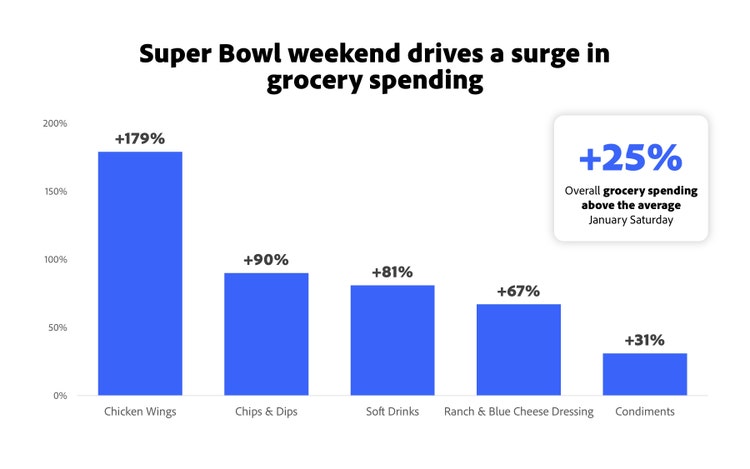 This year, we anticipate a similar grocery boost to unfold, with overall grocery spending up about 10% compared to prior years. Fans are gearing up on the essentials with sugar and sweets (+45%), soft drinks (+45%) and classic Super Bowl staples like chips, salsa and wings, all expected to rise around 40% as kitchens and snack tables get game-day ready.