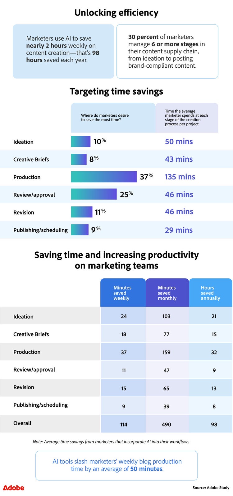 - Integrating AI saves time and money - the marketers surveyed in this study utilise AI to save 114 minutes weekly on content creation, that's 98 hours saved each year, leading to yearly savings of $3,520 per employee for marketing teams.