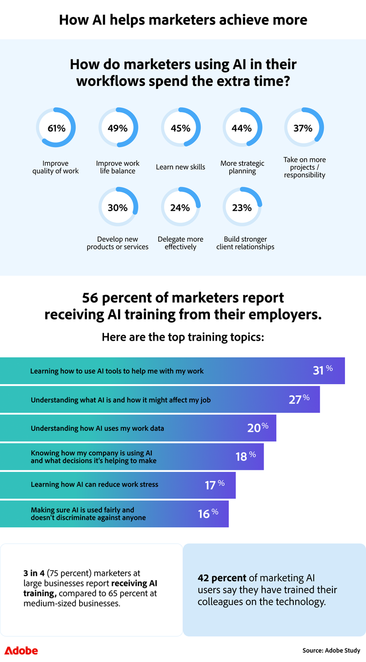 - Marketers utilising AI in their workflows say they use the extra time to improve the quality of their work (61 per cent), improve work-life balance (49 per cent) and learn new skills (45 per cent).