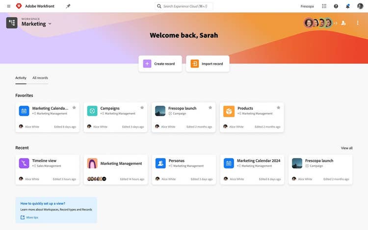 Adobe Workfront provides capabilities from planning and workflow to automation and integration. This supports a system of record for marketing, a single source of truth that connects the full marketing lifecycle across campaigns, marketing operations, creative, and content, so cross-functional teams can execute the right work, from anywhere.