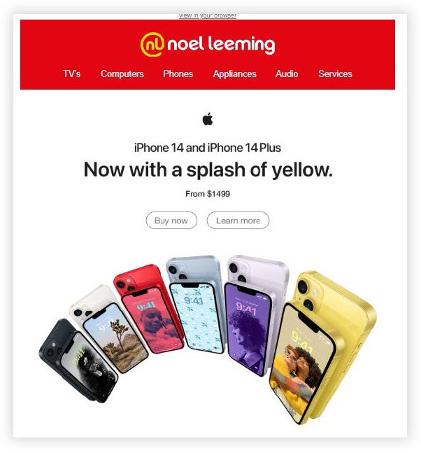 Another campaign leveraged information from across brands to advertise a new iPhone colorway. When Apple released the iPhone in yellow, TWG wanted to get the word out and encourage customers to shop at Noel Leeming stores. But to better understand who might be interested in Apple devices, marketers also expanded audience queries to The Warehouse customers. Promotions of the new yellow iPhone were sent via email to Noel Leeming customers who owned an iOS device as well as Noel Leeming and The Warehouse customers who browsed, added items to a cart or wish list, or purchased products.