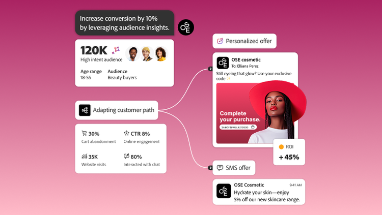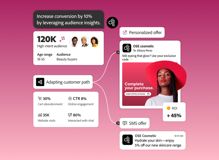 Build a fuller customer view with Adobe’s semantic intelligence that unifies structured data, like CRM or channel engagement, with more complex signals like conversational intent, audio and video content. Activate that context and meaning to power real-time personalisation across channels and AI-powered conversational experiences.