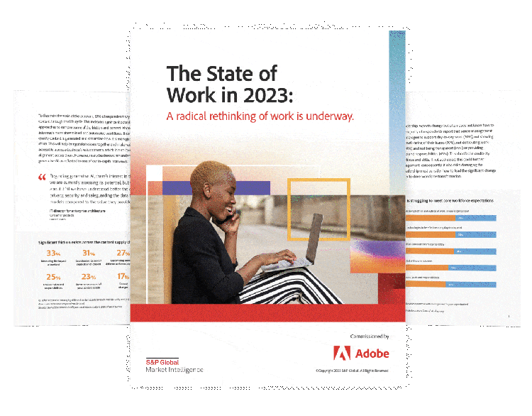 Adobe has partnered with S&P Global Market Intelligence to survey the landscape of work — how it’s changing and what workers need to be successful. Now in its eighth year, State of Work in 2023: A Radical Rethinking of Work is Underway, shows how operational cultures must change for employees and leaders to pace the challenges — and opportunities — defining today’s shifting work landscape.