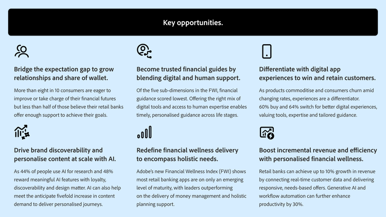 Based on Adobe modelling and industry benchmarks across the retail banking landscape, personalised financial wellness strategies have the potential to deliver: