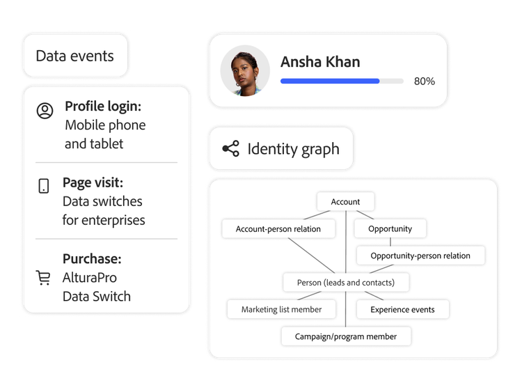 - Unifiez les données issues de différentes sources dans des profils exploitables pour proposer des expériences cross-canal personnalisées grâce à une gestion des données et une résolution des identités avancées.