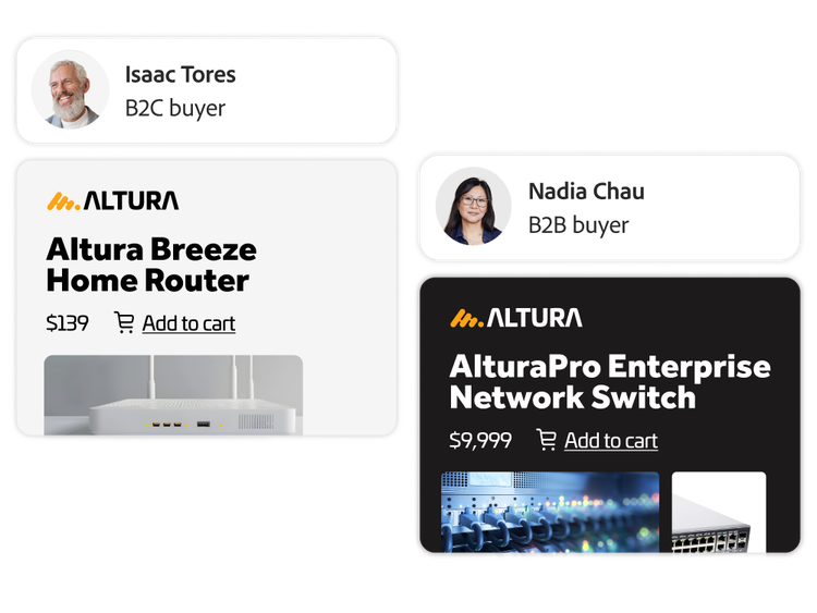 - Aangepaste ervaringen. Creëer verschillende ervaringen voor B2B- versus B2C-klanten. Laat afzonderlijke branding, aanbiedingen, prijzen en catalogi zien op basis van het type klant dat zich aanmeldt.