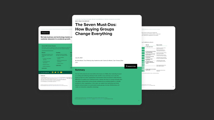 In het Forrester-rapport The Seven Must-Dos: How Buying Groups Change Everything (De zeven must-do's: hoe inkoopgroepen alles veranderen) ontdek je hoe marketing- en verkoopteams met behulp van inkoopgroepen efficiënter kunnen samenwerken bij het aantrekken en warm houden van afzonderlijke groepsleden en zo sneller deals kunnen sluiten.
