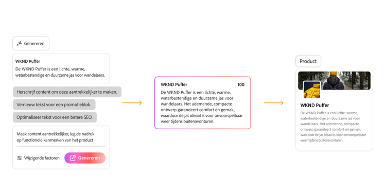 - Contentcreatie met generatieve AI maakt het eenvoudiger dan ooit om hoogwaardige teksten en afbeeldingen te genereren voor je site. Met één klik kun je honderden variaties produceren en testen met ingebouwde A/B-testen om de winnaars te onderscheiden. Je kunt je productmerchandising ook verbeteren met door AI gegenereerde variaties van afbeeldingen en snelle levering van afbeeldingen en video's via een geïntegreerd DAM-systeem (digital asset management), zodat klanten een meeslepende ervaring krijgen die hun aandacht voor je producten vergroot en resulteert in aankopen.