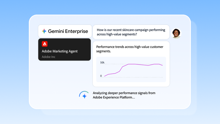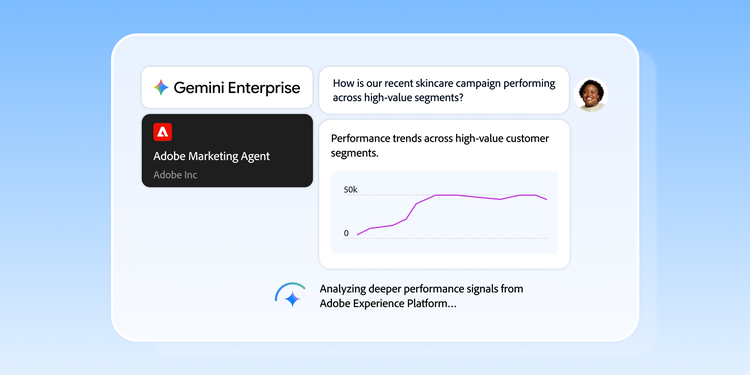 Built on the Agent-to-Agent (A2A) framework, the Adobe Marketing Agent connects securely and in real time to the Adobe Experience Platform Agent Orchestrator. When a marketer asks a question inside Gemini Enterprise, the agent reasons across live data and returns an answer that reflects the current state of their business. This is not a cached report or a static summary. It's a direct connection to the enterprise's own customer intelligence.