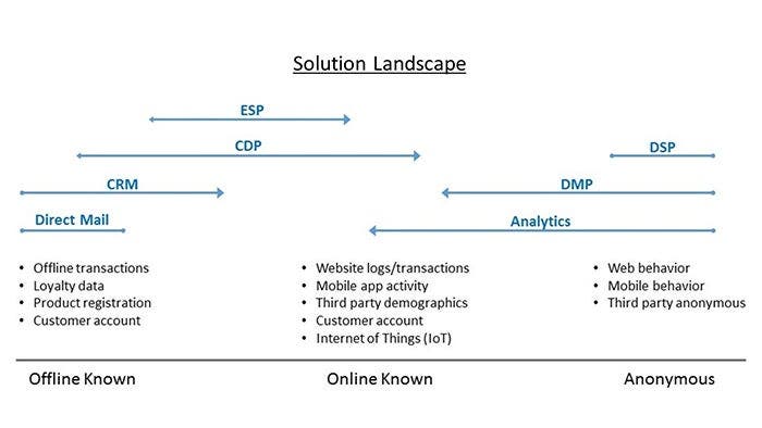 Delivering the real-time personalized experiences that today’s consumers demand starts with building a holistic understanding of the customer, a unified profile. Many traditional and new technologies have evolved in the market to address at least part of the challenges inherent in delivering personalized experiences, including customer relationship management (CRM) systems, data management platforms (DMP), customer data platforms (CDP), email service providers (ESPs), demand-side platforms (DSPs) personalization engines, and customer analytics tools (see Figure 1).
