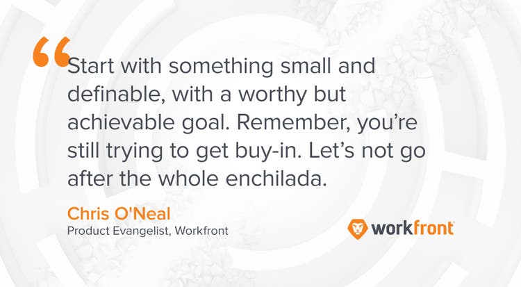 “Start small, prove it out, then refine,” says O’Neal. After your first pilot project is a roaring success, use what you learned to send another project (with another worthy but achievable goal) through the system.