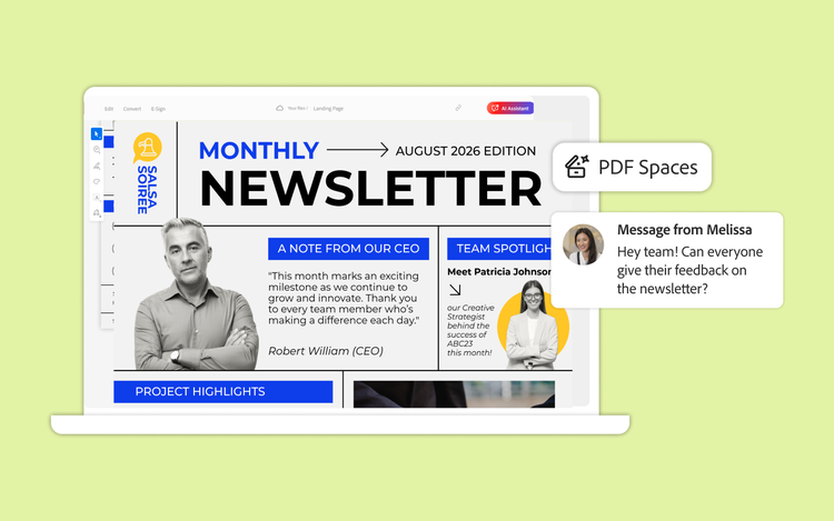 Adobe Acrobat Studio, with its trusted PDF tools, AI Assistant, PDF Spaces, and Adobe Express Premium, is the optimal platform for HR to get it all done. For example, Adobe Express provides a large library of professionally designed templates and assets and powerful editing features for HR teams to quickly and easily create on-brand and engaging content. And PDF Spaces, an AI-powered knowledge hub, makes a wide variety of documents, including organizational strategy plans, employee feedback forms, and training resources, accessible from one place.