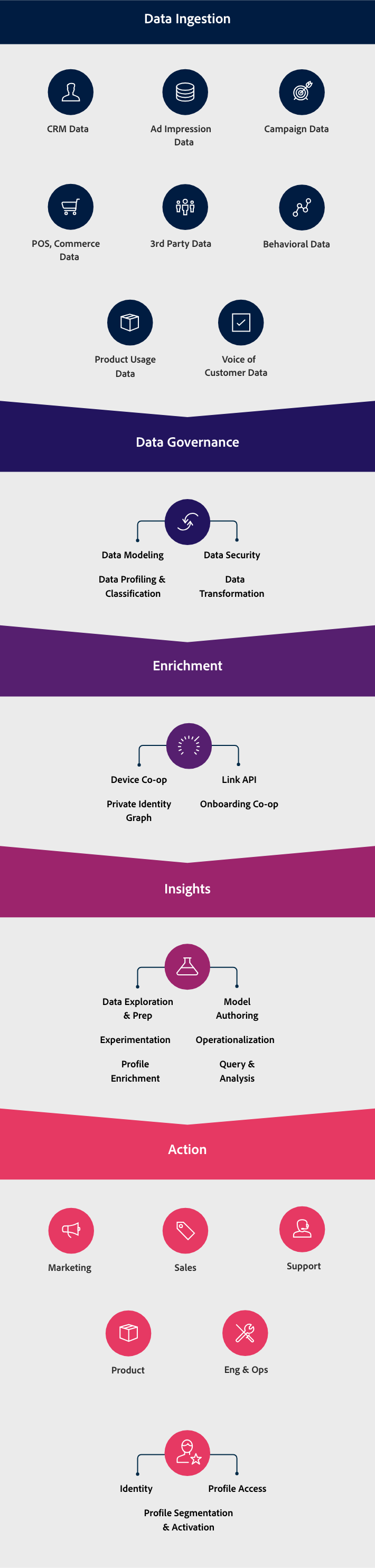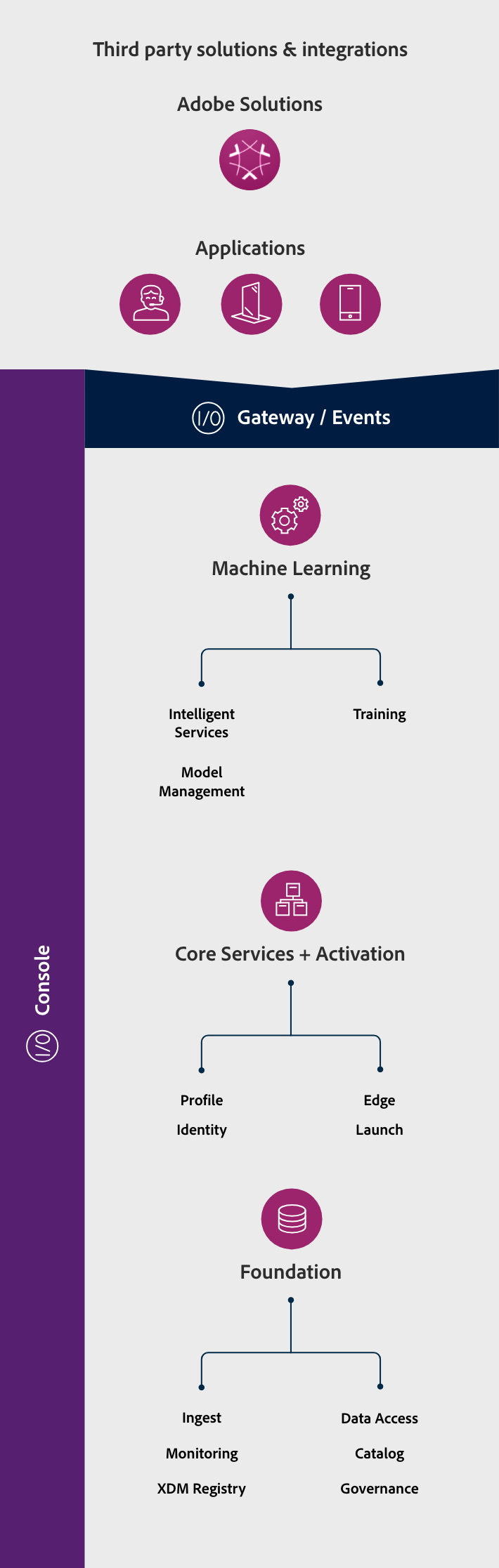 Adobe Experience Platform consists of multiple components. Its multilayer model provides a complete infrastructure on which to build your own custom solutions: