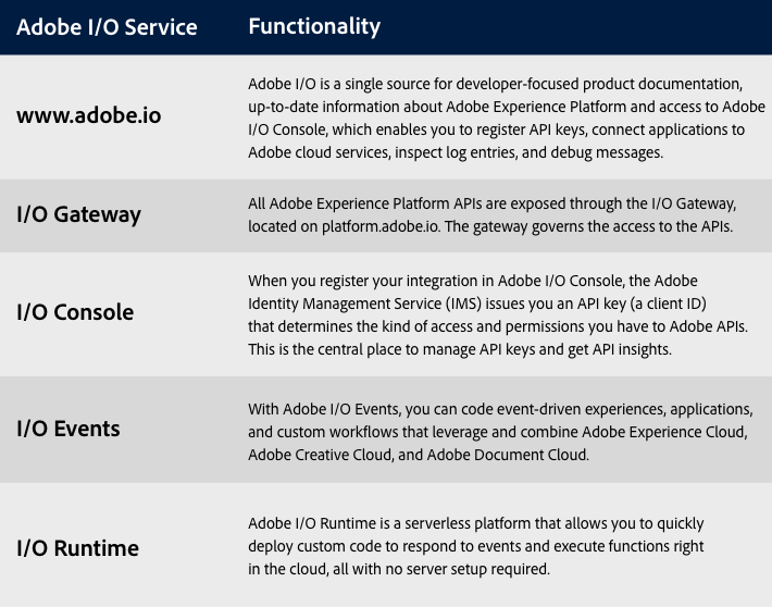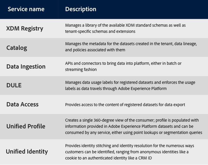 Adobe Experience Platform’s integration capabilities are provided by a collection of services open to your integration through APIs. Some of the key services in Adobe Experience Platform include the following: