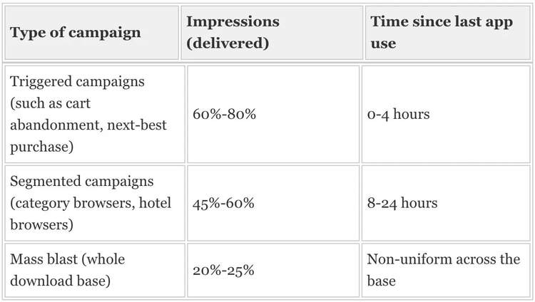 The delivery rate of push notifications is very much dependent on how recently the recipient used the app. The table below shows push message delivery rates in Android (impressions) from Adobe Campaign, depending on the type of campaign.