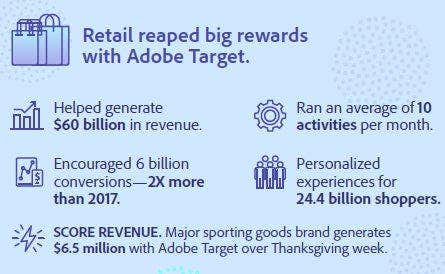 For retail users of Adobe Target, you see that every 2018 statistic was a historical high. To us, that indicates our retail customers are expanding their programs — on average, they’re running 10 experience optimization activities per month. We are thrilled to support them as they optimize more and grow their programs.