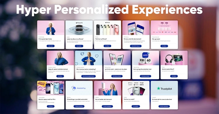O site Telmore.dk mostra diferentes banners principais e cartões de chamada para ação entregues pelo Adobe Target, dependendo das preferências e do comportamento de cada cliente. Um cliente que compra apenas telefones Android pode ver um banner de acessórios compatíveis com Android em vez de uma oferta para o iPhone mais recente. Fãs de cinema veem pacotes de transmissão, e aficionados por jogos veem ofertas de internet de alta velocidade. Nos testes, os banners personalizados aumentaram as novas vendas em 11% em comparação com experiências não personalizadas.