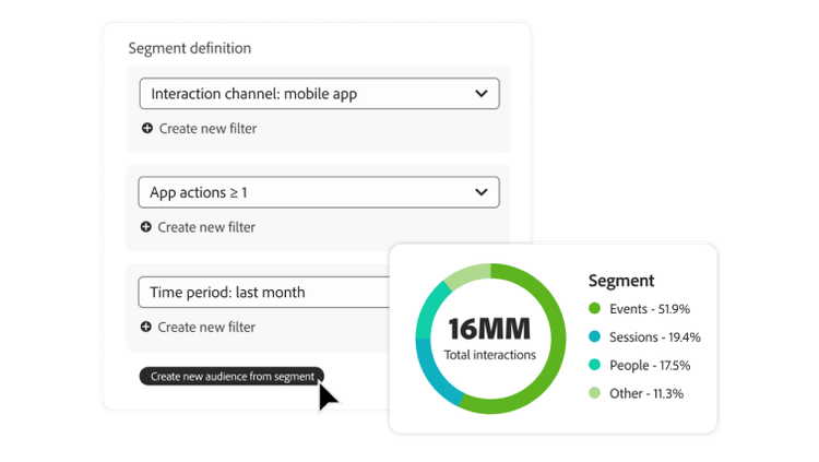 Define and analyze audiences — including their traits and behaviors over time — to gather and share insights for activation across other Adobe Experience Cloud applications.