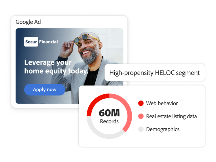 Timing und Targeting sind entscheidend für die Gewinnung neuer hochwertiger Kundschaft im Finanzsektor. Wenn potenzielle Kundschaft auf der Suche nach einer Hypothek, einem Autokredit, einem Sparkonto mit hohen Erträgen oder anderen Finanzprodukten ist, könnt ihr sie mit Adobe über verschiedene Kanäle hinweg gezielt ansprechen – und zwar im benötigten Umfang.