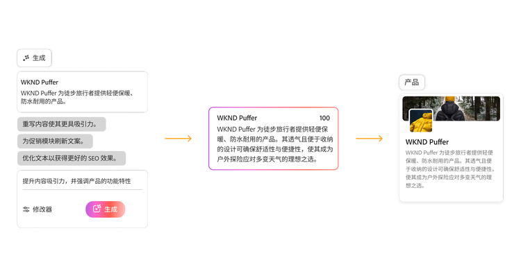 - 生成式 AI 驱动的内容创建 使为您的网站生成效果出色的文案和图像比以往任何时候都更加容易。只需点击一下,即可使用内置的 A/B 测试生成并测试数百个变体,以找出获胜版本。您还可以借助 AI 生成的图像变体以及通过集成数字资产管理系统 (DAM) 高速提供的图像和视频来提升产品促销效果,为购物者提供更有沉浸感的体验,让他们近距离感受产品,进而促成购买。
