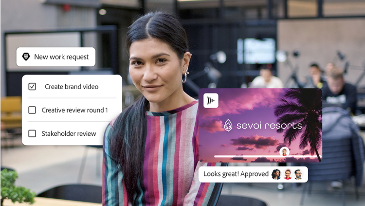 - 跨应用同步工作流程。 轻松跨应用程序维护状态和审批,包括 Adobe Workfront、Adobe GenStudio for Performance Marketing、Adobe Express、Frame.io、Adobe Creative Cloud 和 Adobe Experience Manager Assets。