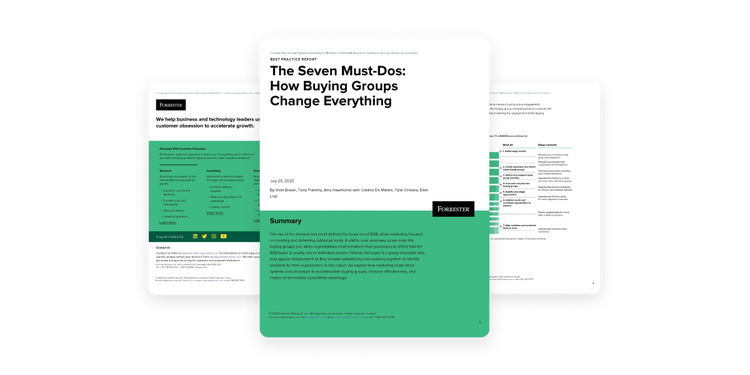 En el informe de Forrester The Seven Must-Dos: How Buying Groups Change Everything, aprenderás cómo los grupos de compra ayudan a que los equipos de marketing y ventas colaboren para atraer y madurar a miembros individuales del grupo con mayor eficiencia con el fin de cerrar acuerdos en menos tiempo.
