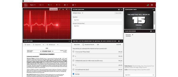 The custom "Pulse Check" Adobe Connect layout provided to teachers by Kolbe Academy, enables a quick view into student understanding via a "Class Discussion" Chat pod and Poll pods that include lesson comprehension questions and a level of understanding ranking.