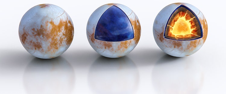 AR 3D assets showcasing Europa in three states: 1) as a whole 2) cross-section revealing a giant ocean under its icy crust, and 3) cross-section revealing its heated iron core and suspected geo-thermal activities.