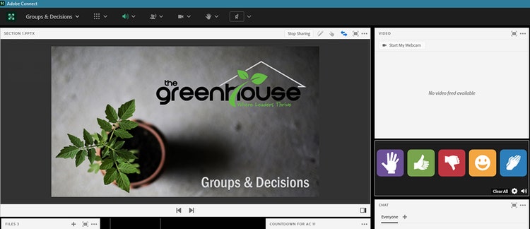 Adobe Connect pods enable diverse virtual meeting functionalities for the Greenhouse program, such as breakout rooms, polls, games, whiteboards, slide presentations, and more for multiple training session layout options.