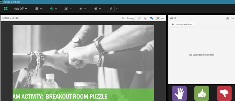 With Adobe Connect, the company can combine dozens of virtual meeting functions, known as pods, to create just the right set up for any type of lesson. Pods can be applied all at once on the same visual and versatile creative canvas that Adobe Connect provides. Teaching facilitators can display video of themselves, switch to a slide presentation, or invite participants to draw together on a whiteboard. Behind the scenes, session producers might display a poll for participants, boot up an interactive game, or separate participants into breakout rooms for more intimate conversations.