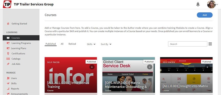 TIP Trailer Services originally implemented Adobe Learning Manager because of its ability to track course completions and generate reports for required compliance training. With its new focus on re-skilling and up-skilling a global workforce, TIP Trailer Services uses Adobe Learning Manager to advance strategic business goals.