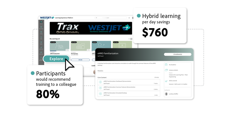 The shift to hybrid learning shortened classroom sessions. Facilitators can host two sessions per day instead of one, doubling the number of people trained and reducing facilitator time. This saves $760 per day while also eliminating any overtime costs paid to AMEs attending training after work hours. With greater flexibility from hybrid training and virtual classrooms, WestJet trained 96% of its 850 production AMEs across 12 cities in just six weeks.