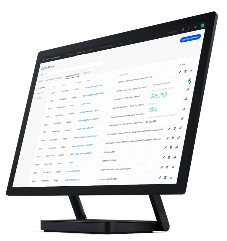 Our people-based destinations feature makes Adobe Audience Manager the first and only DMP of its kind to activate audiences in people-based channels like, social networks, by using hashed identifiers, like customer emails. It lets you reach the right customers with the right experience and combine segments in both restricted platforms and open-web environments, all while utilising the full functionality of your DMP.