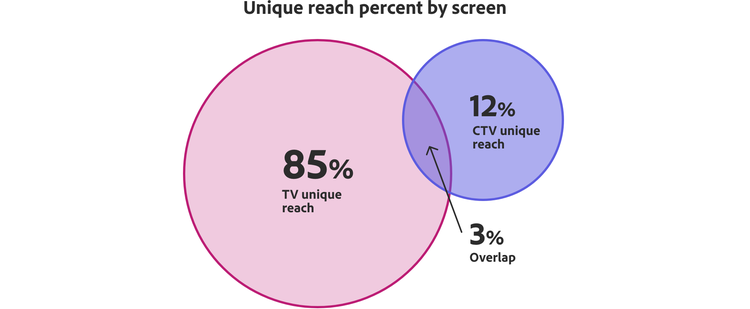Eine Online-Immobilienmarke, die traditionell im linearen Fernsehen Werbung schaltet, wollte ihre Reichweite auf CTV ausdehnen, war aber nicht sicher, ob und wie die Zielgruppen sich zwischen den beiden Formaten unterschieden. Mithilfe von X-Screen+ fand die Online-Immobilienmarke heraus, dass es bei der Reichweite eine Überlappung von nur 3 % zwischen der Zielgruppe im linearen Fernsehen und der Zielgruppe auf CTV gab. 70 % der auf CTV erreichten Zuschauenden bekamen die Werbe-Spots im linearen Fernsehen gar nicht zu sehen, was den Wert von CTV beim Erreichen neuer Zielgruppen sehr deutlich machte. Durch diese Erkenntnis konnte die Marke ihre Strategie zum Medien-Mix neu definieren und sich auf CTV eine völlig neue Zielgruppe erschließen.
