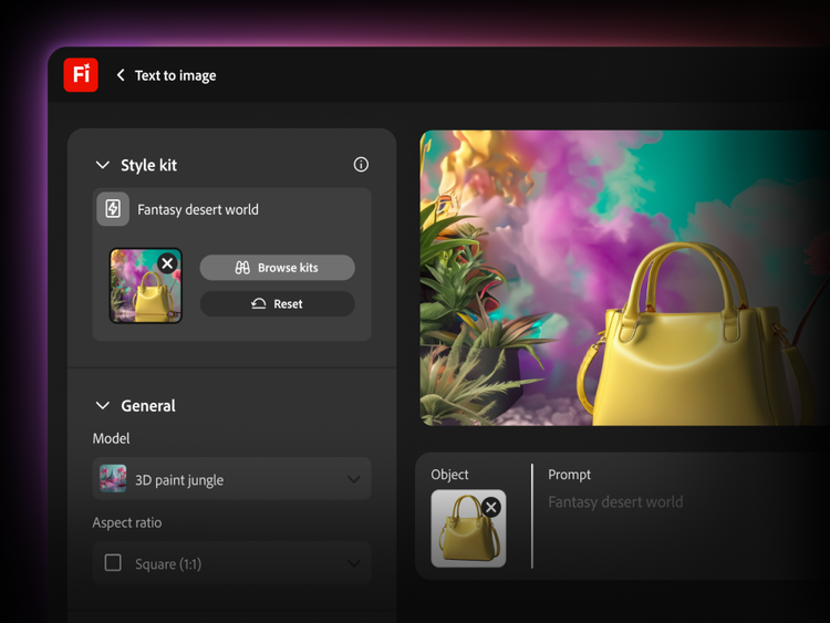 - Konsistente Erstellung. Richtet Stil-Kits mit Referenzbildern, Effekten, Prompts und Objekten ein und gebt sie frei, damit die Erstellung kreativer Inhalte im ganzen Unternehmen konsistent bleibt.