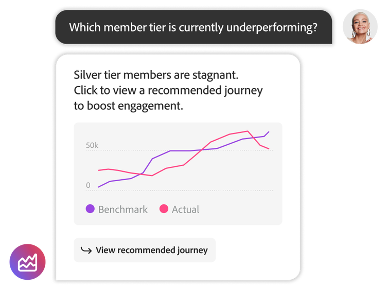 Ein speziell entwickelter AI Agent identifiziert proaktiv Risiken oder Chancen für den Erfolg eines Treueprogramms. Er kann dann ermitteln, welche Belohnungen, Angebote und Erlebnisse am ehesten Interaktion, Bindung und zusätzliche Ausgaben für verschiedene Mitglieder steigern – und sogar einen Entwurf der empfohlenen Journeys, Herausforderungen oder des Messagings erstellen. Durch das Lernen aus Verhalten und Ergebnissen im Laufe der Zeit hilft KI dabei, nächste beste Aktionen zu optimieren, das Abwanderungsrisiko zu reduzieren und Treueprogramme personalisierter und effektiver zu gestalten.