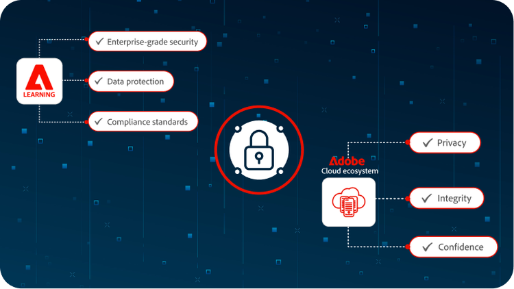 Sowohl die Daten von Lernenden als auch von Admin-Personal sind durch Verschlüsselung auf Unternehmensniveau geschützt. Dazu gehören vollständige Audit-fähige Kontrollen sowie die Möglichkeit, den Zugriff zu verwalten, Daten zu exportieren oder zu löschen: alles im Einklang mit globalen Datenschutzbestimmungen. Gehostet auf Adobes sicherer Infrastruktur, erfüllen alle unsere KI-Services globale Datenschutzbestimmungen und stellen sicher, dass Kundendaten niemals für das Training von Modellen verwendet oder ohne Einverständnis geteilt werden.